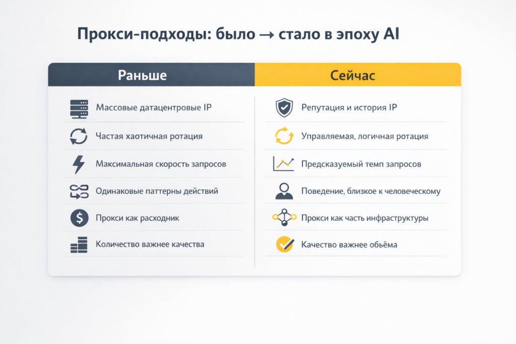 Поэтому выбор прокси всё чаще определяет не масштаб пула, а его пригодность: небольшой пул с согласованным поведением часто превосходит крупный, но противоречивый по сигналам.