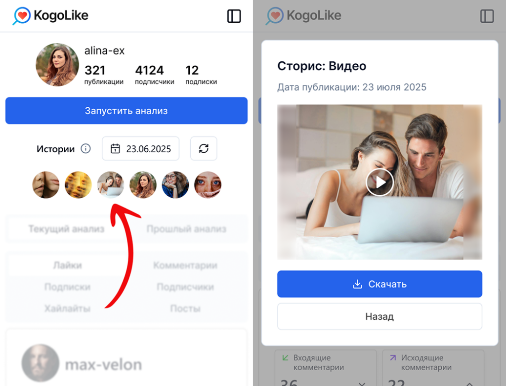 Одно из ключевых отличий Kogolike от других инстаграм*-шпионов заключается в том, что сторис сохраняются на стороне сервиса. На платных тарифах сбор происходит автоматически и ежедневно. Даже если вы забудете запустить проверку вручную, сервис сам соберёт актуальные истории и сохранит их для вас.