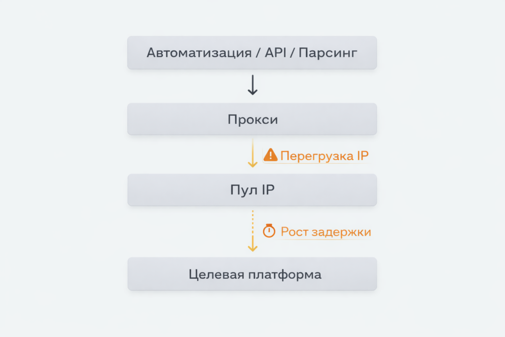 | Перегрузка IP | Много запросов через один адрес | Рост задержек и сбоев |