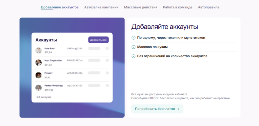 FBTOOL часто используют команды, которые ведут сразу несколько кабинетов. Сервис помогает централизовать контроль и сократить время на переключение между аккаунтами.