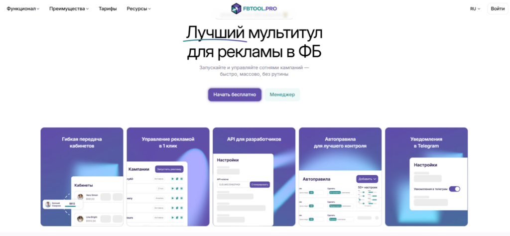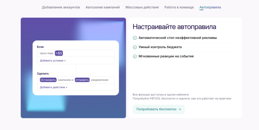 В этот момент многие специалисты приходят к необходимости автоматизации. Не ради скорости как таковой, а чтобы сократить количество ручных действий и снизить операционную нагрузку. Именно под такие задачи и используется FBTOOL — сервис, который помогает систематизировать работу с рекламой в Meta*.
