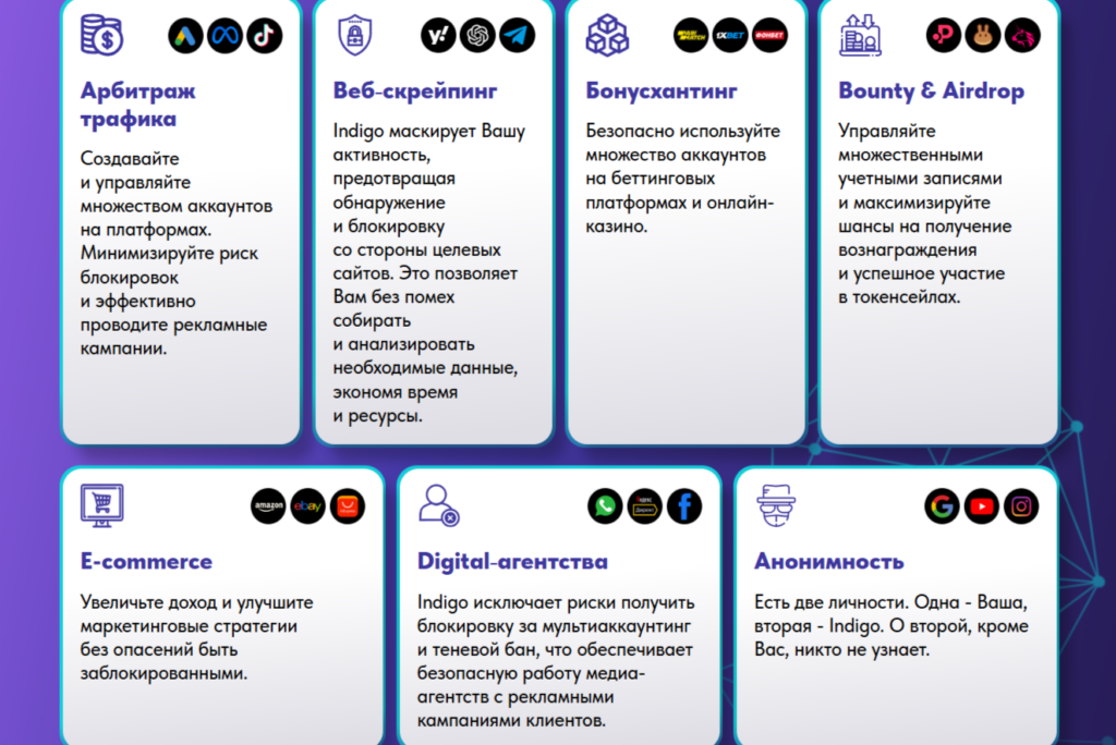 Именно здесь используется Indigo Browser — специализированная среда для изоляции браузерных профилей и выстраивания стабильной инфраструктуры работы.