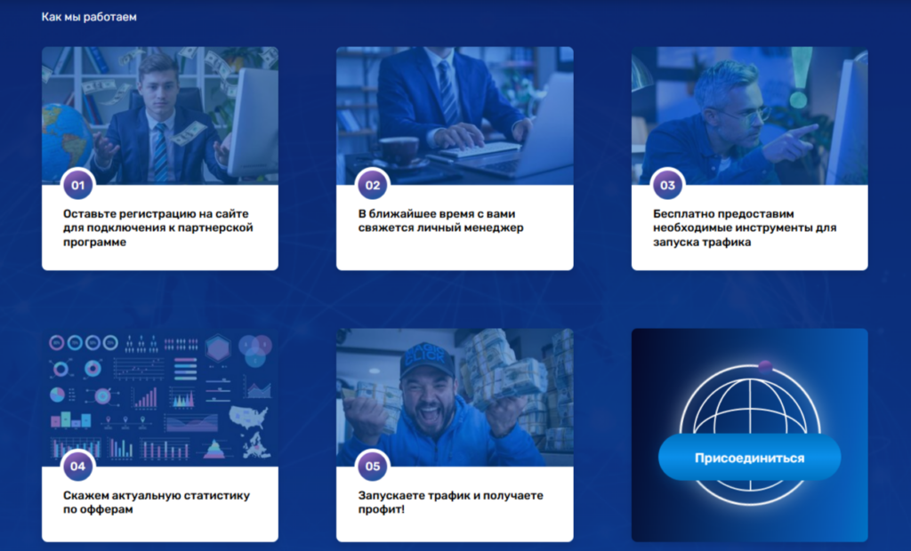 Схема сотрудничества простая и прозрачная: партнер получает уникальную ссылку с ID, продвигает оффер через выбранный источник трафика, пользователь выполняет целевое действие (регистрация, депозит) — партнер получает выплату по условиям оффера.