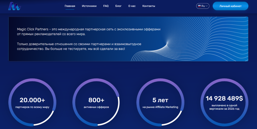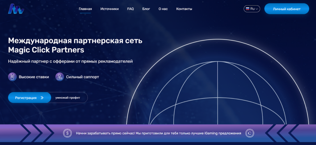 Magic Click — международная CPA-сеть, ориентированная на performance-маркетинг. Она работает более 5 лет, объединяет свыше 20 000 партнеров по всему миру и предлагает прямые офферы от рекламодателей без посредников.