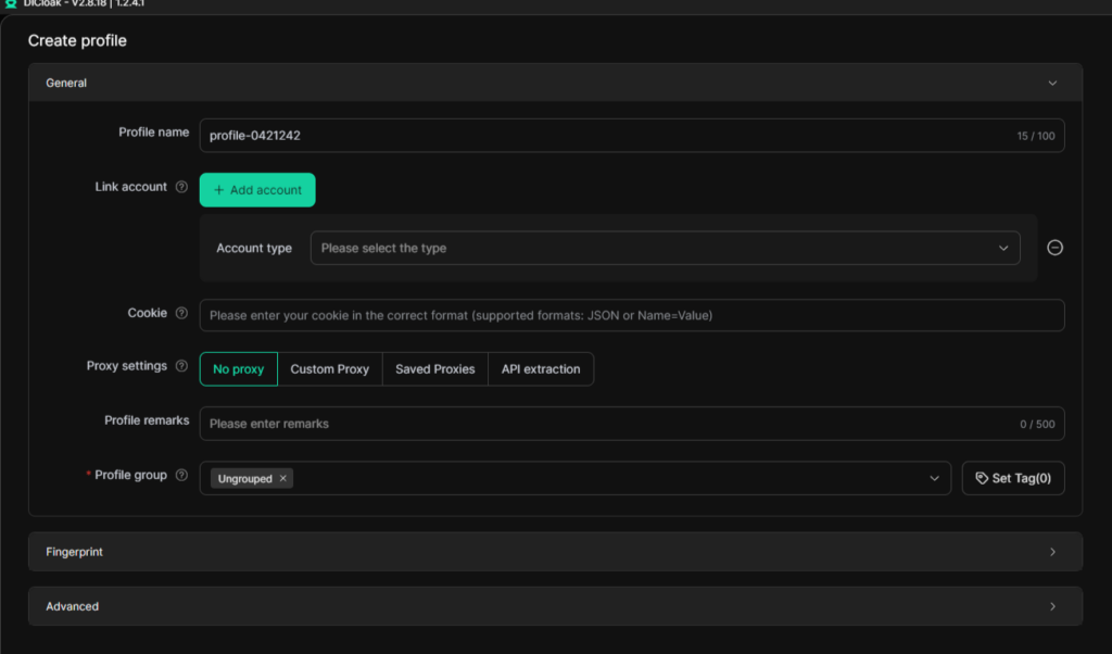 Профиль в DICloak — это отдельная изолированная среда браузера. Он имитирует отдельное устройство с уникальными параметрами, что позволяет безопасно работать с несколькими аккаунтами одновременно.