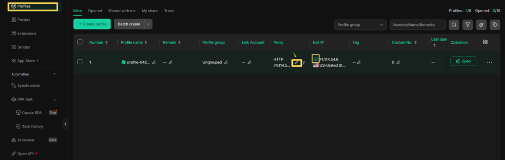 После того как прокси добавлен и назначен профилю, он отобразится в общем списке профилей в разделе Profiles.