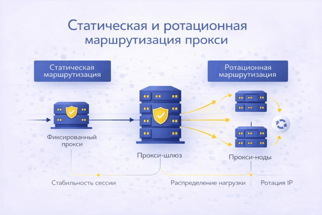 Существует два основных подхода к маршрутизации прокси: статическая маршрутизация и ротационная маршрутизация. Понимание этих моделей помогает сбалансировать производительность, стабильность доступа и непрерывность сессий.